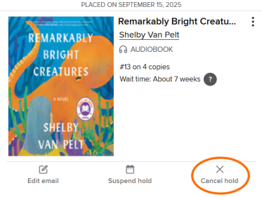 You'll need to be signed into your library to get to this page. - Select Cancel hold under the title you no longer want.